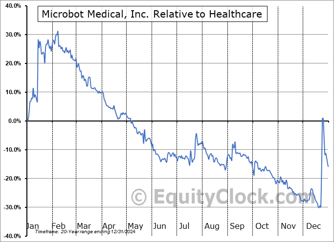 Analysis of the Microbot Medical, Inc. (NASD:MBOT) seasonal charts above shows that a Buy Date of December 19 and a Sell Date of March 10 has resulted in a geometric average return of 6.82% above the benchmark rate of the S&P 500 Total Return Index over the past 20 years. This seasonal timeframe has shown positive results compared to the benchmark in 11 of those periods. This is a fair rate of success and the return strongly outperforms the relative buy-and-hold performance of the stock over the past 20 years by an average of 106.82% per year.