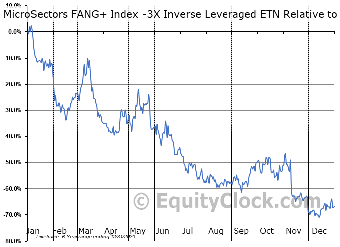 Analysis of the MicroSectors FANG+ Index -3X Inverse Leveraged ETN (NYSE:FNGD) seasonal charts above shows that a Buy Date of February 15 and a Sell Date of May 12 has resulted in a geometric average return of 2.96% above the benchmark rate of the S&P 500 Total Return Index over the past 5 years. This seasonal timeframe has shown positive results compared to the benchmark in 2 of those periods. This is a poor rate of success and the return strongly outperforms the relative buy-and-hold performance of the stock over the past 5 years by an average of 82.05% per year.