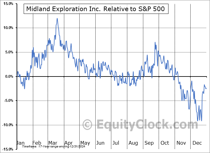 Analysis of the Midland Exploration Inc. (TSXV:MD.V) seasonal charts above shows that a Buy Date of December 22 and a Sell Date of March 16 has resulted in a geometric average return of 14.1% above the benchmark rate of the S&P 500 Total Return Index over the past 17 years. This seasonal timeframe has shown positive results compared to the benchmark in 13 of those periods. This is a good rate of success and the return strongly outperforms the relative buy-and-hold performance of the stock over the past 17 years by an average of 27.46% per year.