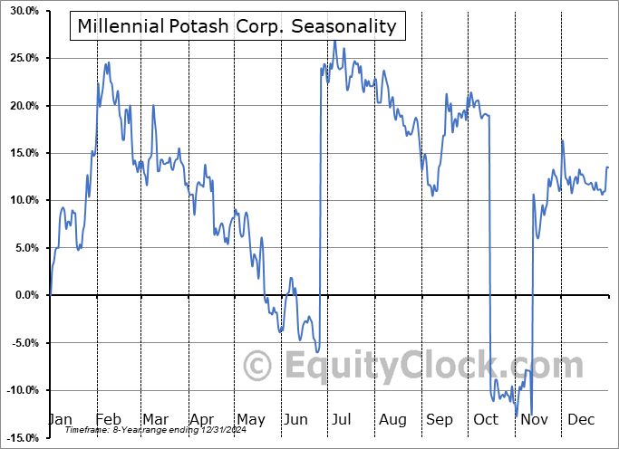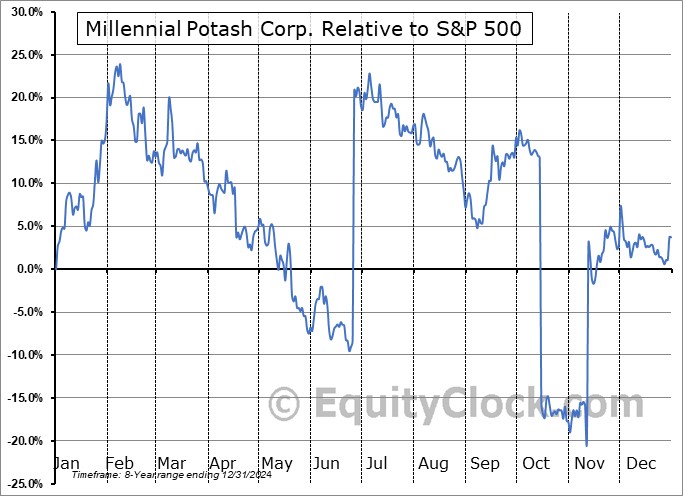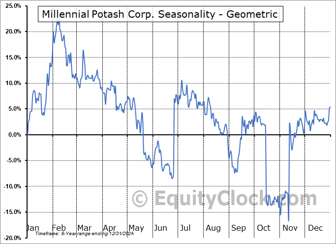 Analysis of the Millennial Potash Corp. (TSXV:MLP.V) seasonal charts above shows that a Buy Date of November 7 and a Sell Date of February 27 has resulted in a geometric average return of 19.61% above the benchmark rate of the S&P 500 Total Return Index over the past 8 years. This seasonal timeframe has shown positive results compared to the benchmark in 7 of those periods. This is a very good rate of success and the return strongly outperforms the relative buy-and-hold performance of the stock over the past 8 years by an average of 27.62% per year.