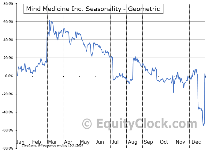 Analysis of the Mind Medicine Inc. (NASD:MNMD) seasonal charts above shows that a Buy Date of December 27 and a Sell Date of April 30 has resulted in a geometric average return of 211.1% above the benchmark rate of the S&P 500 Total Return Index over the past 8 years. This seasonal timeframe has shown positive results compared to the benchmark in 6 of those periods. This is a good rate of success and the return strongly outperforms the relative buy-and-hold performance of the stock over the past 8 years by an average of 226.98% per year.