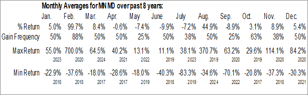 A word of caution: Only 8 years of data is available for shares of MNMD, perhaps insufficient to create a seasonal profile that accurately gauges the seasonal tendencies influencing the investment. Ideally, while 20 years is preferred, at least 10 years of data is required to perform a seasonal analysis that is considered to be reliable for future seasonal periods.