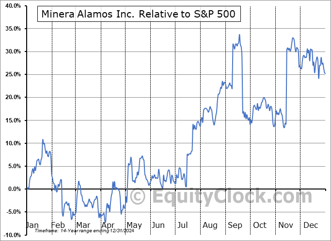 Analysis of the Minera Alamos Inc. (OTCMKT:MAIFF) seasonal charts above shows that a Buy Date of February 24 and a Sell Date of June 5 has resulted in a geometric average return of 10.85% above the benchmark rate of the S&P 500 Total Return Index over the past 14 years. This seasonal timeframe has shown positive results compared to the benchmark in 10 of those periods. This is a good rate of success and the return strongly outperforms the relative buy-and-hold performance of the stock over the past 14 years by an average of 24.88% per year.