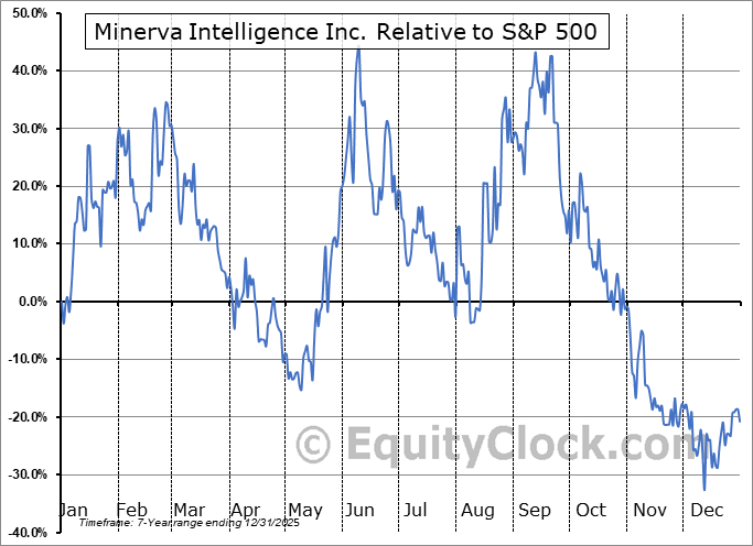 Analysis of the Minerva Intelligence Inc. (TSXV:MVAI.V) seasonal charts above shows that a Buy Date of July 18 and a Sell Date of October 6 has resulted in a geometric average return of 22.81% above the benchmark rate of the S&P 500 Total Return Index over the past 6 years. This seasonal timeframe has shown positive results compared to the benchmark in 5 of those periods. This is a very good rate of success and the return strongly outperforms the relative buy-and-hold performance of the stock over the past 6 years by an average of 60.12% per year.