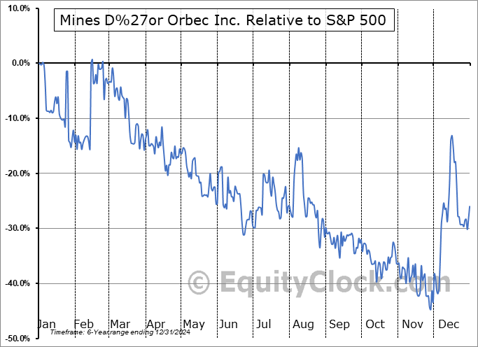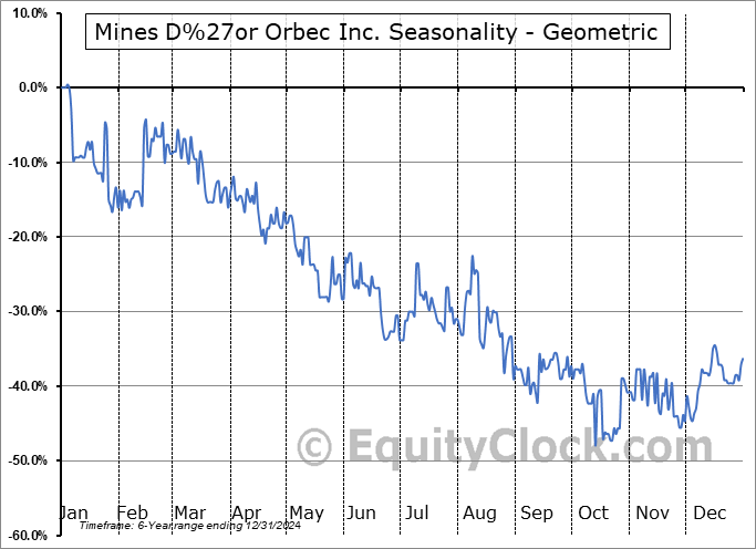 Analysis of the Mines D%27or Orbec Inc. (TSXV:BLUE.V) seasonal charts above shows that a Buy Date of October 13 and a Sell Date of January 1 has resulted in a geometric average return of 14.21% above the benchmark rate of the S&P 500 Total Return Index over the past 6 years. This seasonal timeframe has shown positive results compared to the benchmark in 4 of those periods. This is a good rate of success and the return strongly outperforms the relative buy-and-hold performance of the stock over the past 6 years by an average of 60.06% per year.