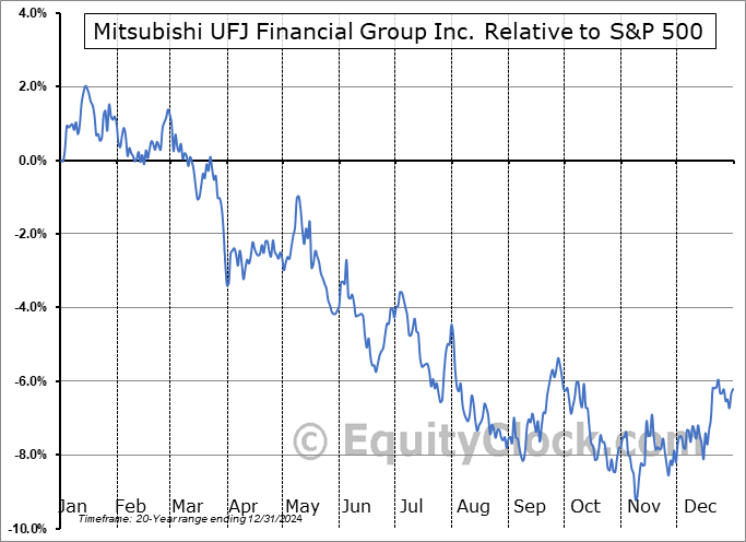Analysis of the Mitsubishi UFJ Financial Group Inc. (NYSE:MUFG) seasonal charts above shows that a Buy Date of November 13 and a Sell Date of February 6 has resulted in a geometric average return of 1.54% above the benchmark rate of the S&P 500 Total Return Index over the past 20 years. This seasonal timeframe has shown positive results compared to the benchmark in 14 of those periods. This is a good rate of success and the return strongly outperforms the relative buy-and-hold performance of the stock over the past 20 years by an average of 10.13% per year.