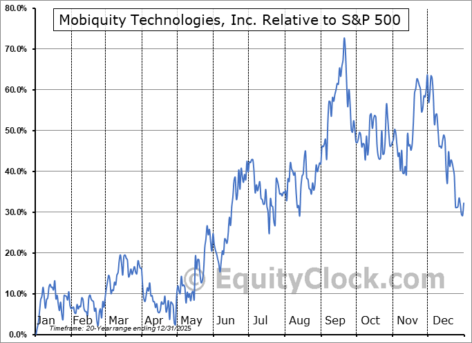 Analysis of the Mobiquity Technologies, Inc. (OTCMKT:MOBQ) seasonal charts above shows that a Buy Date of February 23 and a Sell Date of June 26 has resulted in a geometric average return of 3.05% above the benchmark rate of the S&P 500 Total Return Index over the past 20 years. This seasonal timeframe has shown positive results compared to the benchmark in 13 of those periods. This is a good rate of success and the return strongly outperforms the relative buy-and-hold performance of the stock over the past 20 years by an average of 103.05% per year.