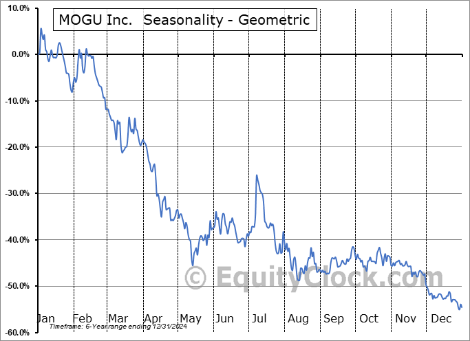 A word of caution: Only 6 years of data is available for shares of MOGU, perhaps insufficient to create a seasonal profile that accurately gauges the seasonal tendencies influencing the investment. Ideally, while 20 years is preferred, at least 10 years of data is required to perform a seasonal analysis that is considered to be reliable for future seasonal periods.