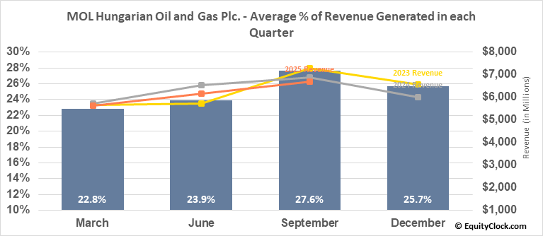 MOL Hungarian Oil and Gas PLC is a multinational integrated oil and gas company. The group has various segments which include Upstream, Downstream, Consumer services, Gas midstream, and Corporate and other. The Downstream segment derives the majority of the revenue which consists of different business activities that are part of an integrated value chain that turns crude oil into a range of refined products, which are moved and marketed for household, industrial, and transport use. Geographically its sales come from Hungary, Croatia, Slovakia, Italy, Czech Republic, Romania, Austria, Europe, and the Rest of the World.