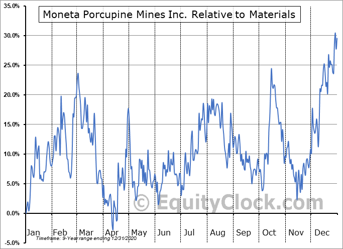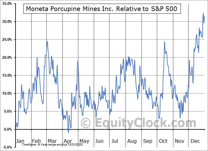 Analysis of the Moneta Porcupine Mines Inc. (OTCMKT:MPUCF) seasonal charts above shows that a Buy Date of November 17 and a Sell Date of February 12 has resulted in a geometric average return of 17.96% above the benchmark rate of the S&P 500 Total Return Index over the past 9 years. This seasonal timeframe has shown positive results compared to the benchmark in 5 of those periods. This is a fair rate of success and the return strongly outperforms the relative buy-and-hold performance of the stock over the past 9 years by an average of 26.58% per year.