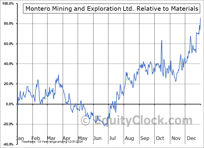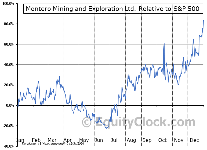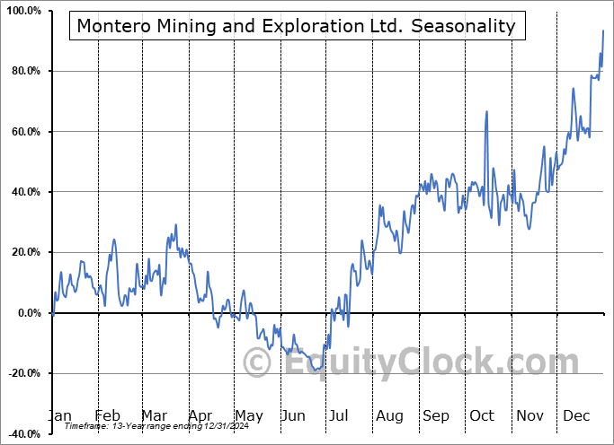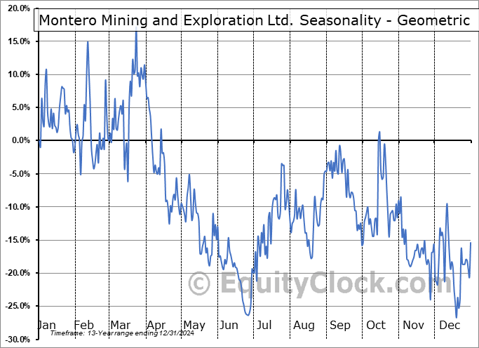 Analysis of the Montero Mining and Exploration Ltd. (TSXV:MON.V) seasonal charts above shows that a Buy Date of December 19 and a Sell Date of March 25 has resulted in a geometric average return of 24.71% above the benchmark rate of the S&P 500 Total Return Index over the past 13 years. This seasonal timeframe has shown positive results compared to the benchmark in 10 of those periods. This is a good rate of success and the return strongly outperforms the relative buy-and-hold performance of the stock over the past 13 years by an average of 51.36% per year.