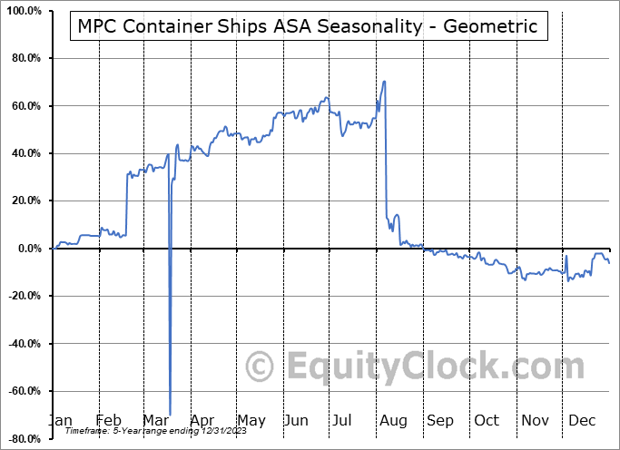 Analysis of the MPC Container Ships ASA (OTCMKT:MPZZF) seasonal charts above shows that a Buy Date of December 4 and a Sell Date of March 22 has resulted in a geometric average return of 56.64% above the benchmark rate of the S&P 500 Total Return Index over the past 5 years. This seasonal timeframe has shown positive results compared to the benchmark in 4 of those periods. This is a very good rate of success and the return strongly outperforms the relative buy-and-hold performance of the stock over the past 5 years by an average of 75.38% per year.