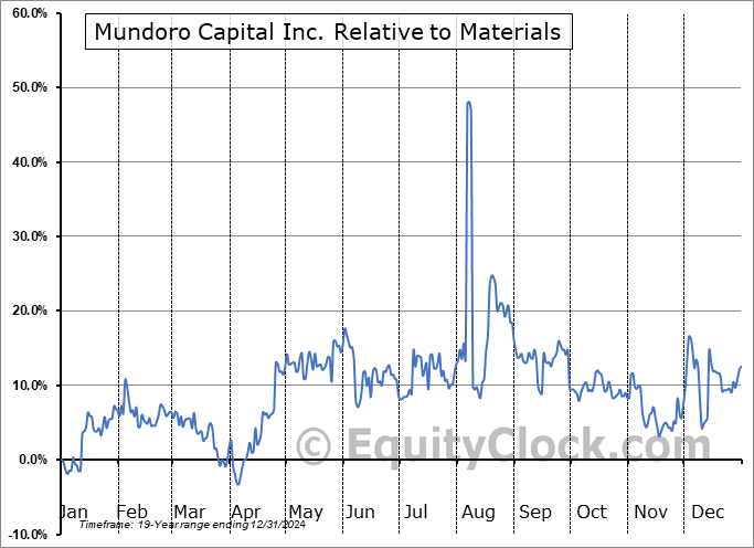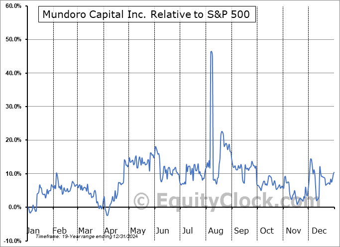 Analysis of the Mundoro Capital Inc. (OTCMKT:MUNMF) seasonal charts above shows that a Buy Date of March 29 and a Sell Date of June 17 has resulted in a geometric average return of 4.9% above the benchmark rate of the S&P 500 Total Return Index over the past 19 years. This seasonal timeframe has shown positive results compared to the benchmark in 14 of those periods. This is a good rate of success and the return strongly outperforms the relative buy-and-hold performance of the stock over the past 19 years by an average of 26.72% per year.