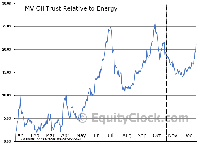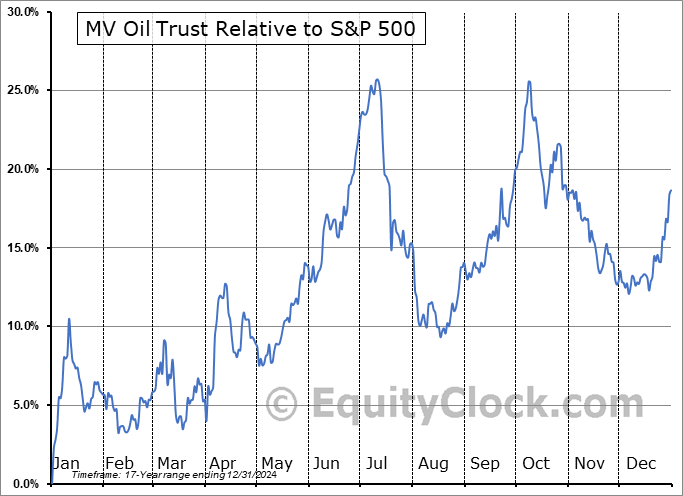 Analysis of the MV Oil Trust (NYSE:MVO) seasonal charts above shows that a Buy Date of March 23 and a Sell Date of July 11 has resulted in a geometric average return of 13.4% above the benchmark rate of the S&P 500 Total Return Index over the past 17 years. This seasonal timeframe has shown positive results compared to the benchmark in 14 of those periods. This is a very good rate of success and the return strongly outperforms the relative buy-and-hold performance of the stock over the past 17 years by an average of 18.74% per year.