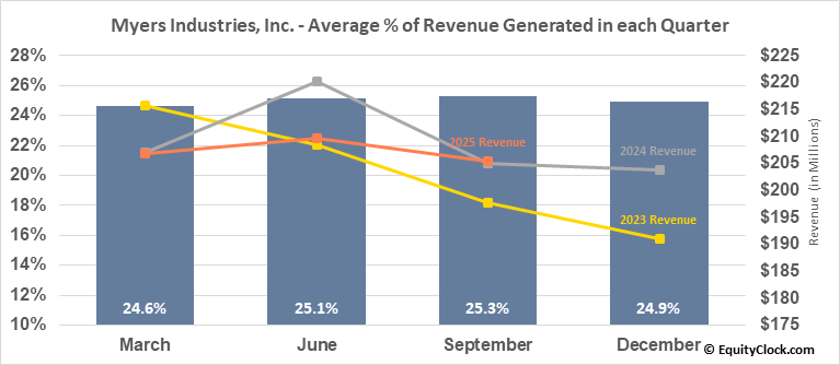 Myers Industries Inc designs, manufactures, and markets a variety of plastic, metal, and rubber products, including a broad selection of plastic reusable containers, pallets, small parts bins, bulk shipping containers, storage and organization products, OEM parts, custom plastic products, consumer fuel containers and tanks for water, fuel and waste handling. It operates through the following segments: The Material Handling segment, which designs manufactures, and markets a variety of plastic and metal products. The Distribution segment offers tools, equipment, and supplies used for tire, wheel, and under-vehicle service on passenger, heavy truck, and off-road vehicles. It generates the majority of its revenue from the Material Handling segment.