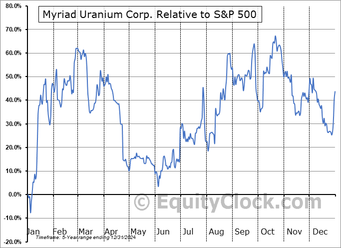 Analysis of the Myriad Uranium Corp. (CSE:M.CA) seasonal charts above shows that a Buy Date of December 19 and a Sell Date of March 10 has resulted in a geometric average return of 76.07% above the benchmark rate of the S&P 500 Total Return Index over the past 5 years. This seasonal timeframe has shown positive results compared to the benchmark in 5 of those periods. This is an excellent rate of success and the return strongly outperforms the relative buy-and-hold performance of the stock over the past 5 years by an average of 53.16% per year.