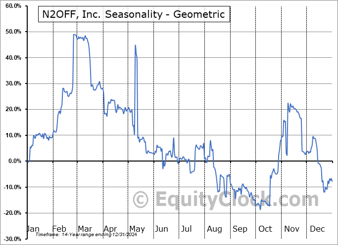 Analysis of the N2OFF, Inc. (NASD:NITO) seasonal charts above shows that a Buy Date of October 17 and a Sell Date of March 10 has resulted in a geometric average return of 82.42% above the benchmark rate of the S&P 500 Total Return Index over the past 14 years. This seasonal timeframe has shown positive results compared to the benchmark in 8 of those periods. This is a fair rate of success and the return strongly outperforms the relative buy-and-hold performance of the stock over the past 14 years by an average of 101.21% per year.