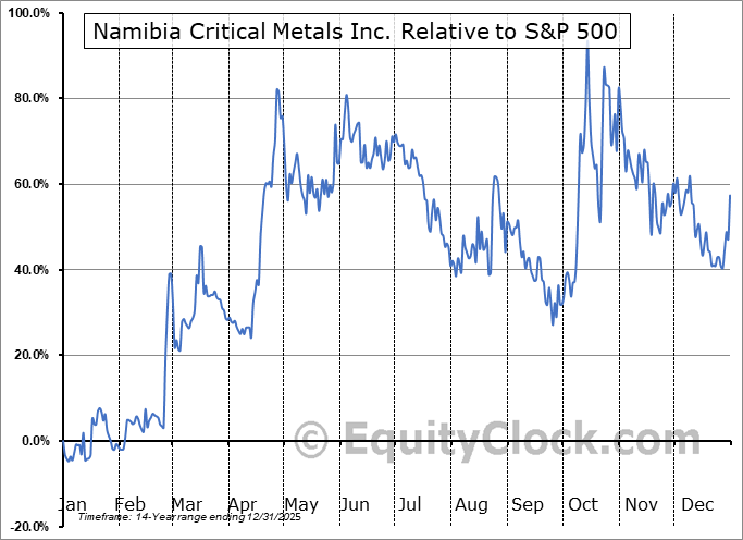 Analysis of the Namibia Critical Metals Inc. (OTCMKT:NMREF) seasonal charts above shows that a Buy Date of January 4 and a Sell Date of April 21 has resulted in a geometric average return of 28.77% above the benchmark rate of the S&P 500 Total Return Index over the past 14 years. This seasonal timeframe has shown positive results compared to the benchmark in 10 of those periods. This is a good rate of success and the return strongly outperforms the relative buy-and-hold performance of the stock over the past 14 years by an average of 46.21% per year.