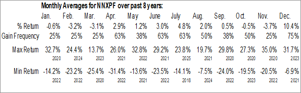 A word of caution: Only 7 years of data is available for shares of NNXPF, perhaps insufficient to create a seasonal profile that accurately gauges the seasonal tendencies influencing the investment. Ideally, while 20 years is preferred, at least 10 years of data is required to perform a seasonal analysis that is considered to be reliable for future seasonal periods.