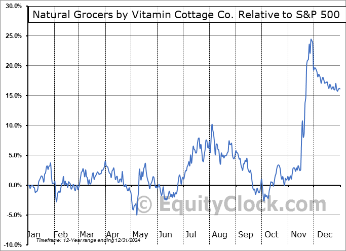 Analysis of the Natural Grocers by Vitamin Cottage Co. (NYSE:NGVC) seasonal charts above shows that a Buy Date of October 3 and a Sell Date of December 26 has resulted in a geometric average return of 15.27% above the benchmark rate of the S&P 500 Total Return Index over the past 12 years. This seasonal timeframe has shown positive results compared to the benchmark in 10 of those periods. This is a very good rate of success and the return strongly outperforms the relative buy-and-hold performance of the stock over the past 12 years by an average of 19.72% per year.