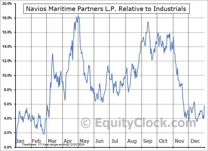 Analysis of the Navios Maritime Partners L.P. (NYSE:NMM) seasonal charts above shows that a Buy Date of June 17 and a Sell Date of September 12 has resulted in a geometric average return of 4.11% above the benchmark rate of the S&P 500 Total Return Index over the past 17 years. This seasonal timeframe has shown positive results compared to the benchmark in 13 of those periods. This is a good rate of success and the return strongly outperforms the relative buy-and-hold performance of the stock over the past 17 years by an average of 17.19% per year.