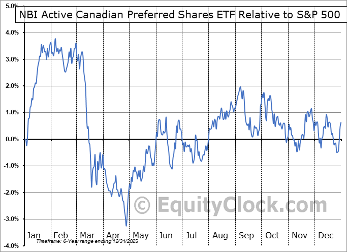 Analysis of the NBI Active Canadian Preferred Shares ETF (TSE:NPRF.TO) seasonal charts above shows that a Buy Date of December 13 and a Sell Date of March 7 has resulted in a geometric average return of 4.13% above the benchmark rate of the S&P 500 Total Return Index over the past 5 years. This seasonal timeframe has shown positive results compared to the benchmark in 5 of those periods. This is an excellent rate of success and the return strongly outperforms the relative buy-and-hold performance of the stock over the past 5 years by an average of 9.17% per year.