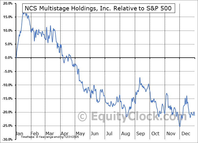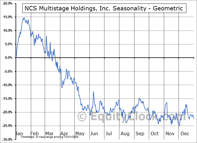 Analysis of the NCS Multistage Holdings, Inc. (NASD:NCSM) seasonal charts above shows that a Buy Date of August 15 and a Sell Date of November 5 has resulted in a geometric average return of 8.35% above the benchmark rate of the S&P 500 Total Return Index over the past 7 years. This seasonal timeframe has shown positive results compared to the benchmark in 5 of those periods. This is a good rate of success and the return strongly outperforms the relative buy-and-hold performance of the stock over the past 7 years by an average of 47.39% per year.