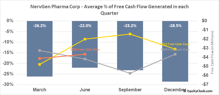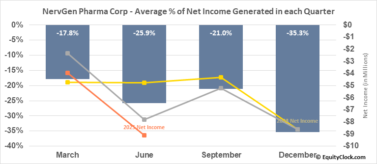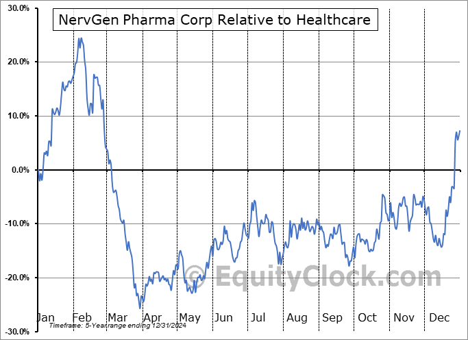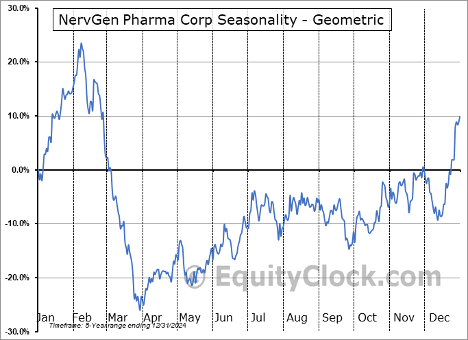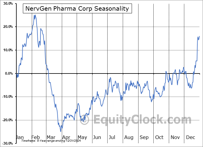 Analysis of the NervGen Pharma Corp (TSXV:NGEN.V) seasonal charts above shows that a Buy Date of September 26 and a Sell Date of February 9 has resulted in a geometric average return of 44.49% above the benchmark rate of the S&P 500 Total Return Index over the past 5 years. This seasonal timeframe has shown positive results compared to the benchmark in 5 of those periods. This is an excellent rate of success and the return strongly outperforms the relative buy-and-hold performance of the stock over the past 5 years by an average of 48.35% per year.