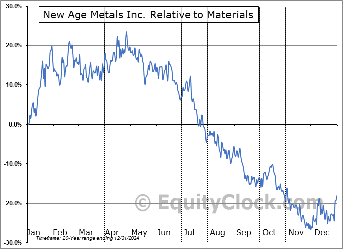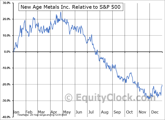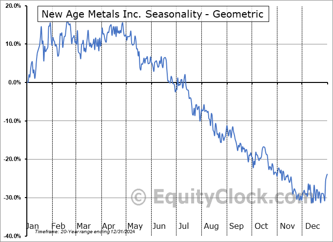 Analysis of the New Age Metals Inc. (TSXV:NAM.V) seasonal charts above shows that a Buy Date of December 12 and a Sell Date of April 12 has resulted in a geometric average return of 24.95% above the benchmark rate of the S&P 500 Total Return Index over the past 20 years. This seasonal timeframe has shown positive results compared to the benchmark in 16 of those periods. This is a very good rate of success and the return strongly outperforms the relative buy-and-hold performance of the stock over the past 20 years by an average of 55.94% per year.