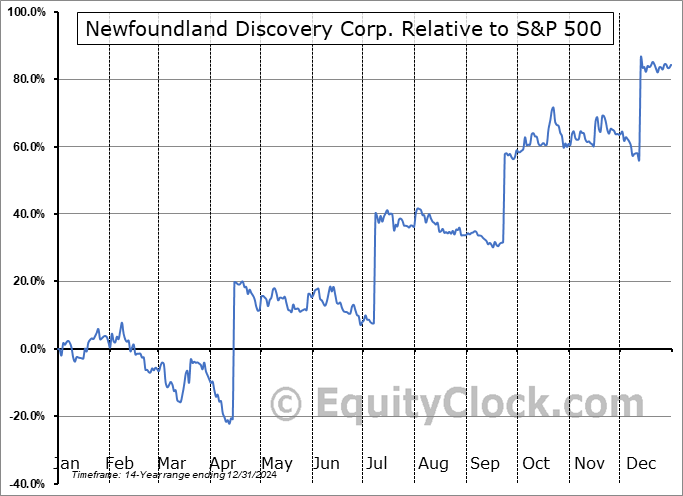 Analysis of the Newfoundland Discovery Corp. (OTCMKT:NEWDF) seasonal charts above shows that a Buy Date of March 19 and a Sell Date of June 11 has resulted in a geometric average return of 4.47% above the benchmark rate of the S&P 500 Total Return Index over the past 13 years. This seasonal timeframe has shown positive results compared to the benchmark in 8 of those periods. This is a fair rate of success and the return strongly outperforms the relative buy-and-hold performance of the stock over the past 13 years by an average of 38.71% per year.