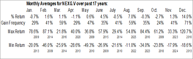 To download NEXG.V seasonal chart data, please log in or Subscribe.