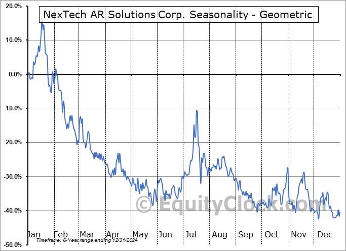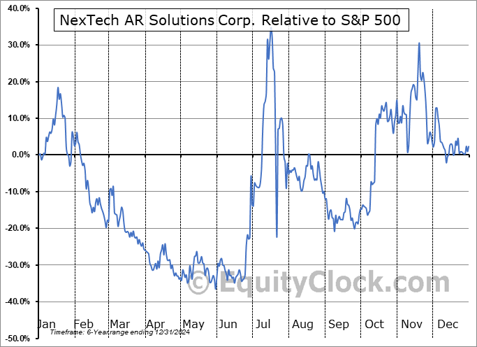 Analysis of the NexTech AR Solutions Corp. (CSE:NTAR.CA) seasonal charts above shows that a Buy Date of November 3 and a Sell Date of January 22 has resulted in a geometric average return of 25.68% above the benchmark rate of the S&P 500 Total Return Index over the past 6 years. This seasonal timeframe has shown positive results compared to the benchmark in 4 of those periods. This is a good rate of success and the return strongly outperforms the relative buy-and-hold performance of the stock over the past 6 years by an average of 73.67% per year.