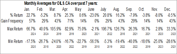 A word of caution: Only 7 years of data is available for shares of OILS.CA, perhaps insufficient to create a seasonal profile that accurately gauges the seasonal tendencies influencing the investment. Ideally, while 20 years is preferred, at least 10 years of data is required to perform a seasonal analysis that is considered to be reliable for future seasonal periods.
