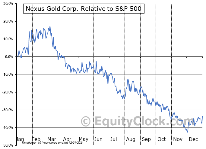 Analysis of the Nexus Gold Corp. (TSXV:NXS.V) seasonal charts above shows that a Buy Date of December 2 and a Sell Date of March 7 has resulted in a geometric average return of 15.54% above the benchmark rate of the S&P 500 Total Return Index over the past 15 years. This seasonal timeframe has shown positive results compared to the benchmark in 9 of those periods. This is a fair rate of success and the return strongly outperforms the relative buy-and-hold performance of the stock over the past 15 years by an average of 58.86% per year.