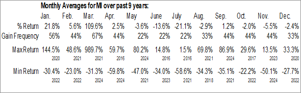 A word of caution: Only 9 years of data is available for shares of MI, perhaps insufficient to create a seasonal profile that accurately gauges the seasonal tendencies influencing the investment. Ideally, while 20 years is preferred, at least 10 years of data is required to perform a seasonal analysis that is considered to be reliable for future seasonal periods.