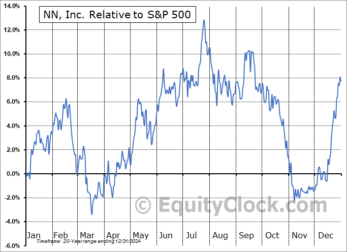 Analysis of the NN, Inc. (NASD:NNBR) seasonal charts above shows that a Buy Date of March 29 and a Sell Date of June 29 has resulted in a geometric average return of 10.18% above the benchmark rate of the S&P 500 Total Return Index over the past 20 years. This seasonal timeframe has shown positive results compared to the benchmark in 16 of those periods. This is a very good rate of success and the return strongly outperforms the relative buy-and-hold performance of the stock over the past 20 years by an average of 24.69% per year.