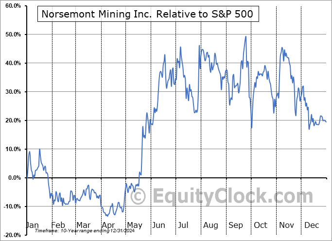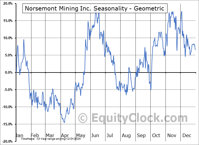 Analysis of the Norsemont Mining Inc. (CSE:NOM.CA) seasonal charts above shows that a Buy Date of August 29 and a Sell Date of January 16 has resulted in a geometric average return of 12.05% above the benchmark rate of the S&P 500 Total Return Index over the past 10 years. This seasonal timeframe has shown positive results compared to the benchmark in 7 of those periods. This is a good rate of success and the return strongly outperforms the relative buy-and-hold performance of the stock over the past 10 years by an average of 17.69% per year.