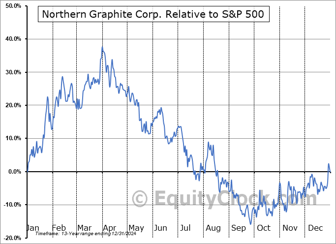 Analysis of the Northern Graphite Corp. (OTCMKT:NGPHF) seasonal charts above shows that a Buy Date of December 27 and a Sell Date of March 31 has resulted in a geometric average return of 28.31% above the benchmark rate of the S&P 500 Total Return Index over the past 13 years. This seasonal timeframe has shown positive results compared to the benchmark in 10 of those periods. This is a good rate of success and the return strongly outperforms the relative buy-and-hold performance of the stock over the past 13 years by an average of 54.86% per year.