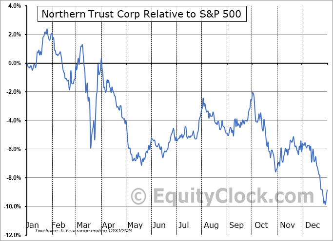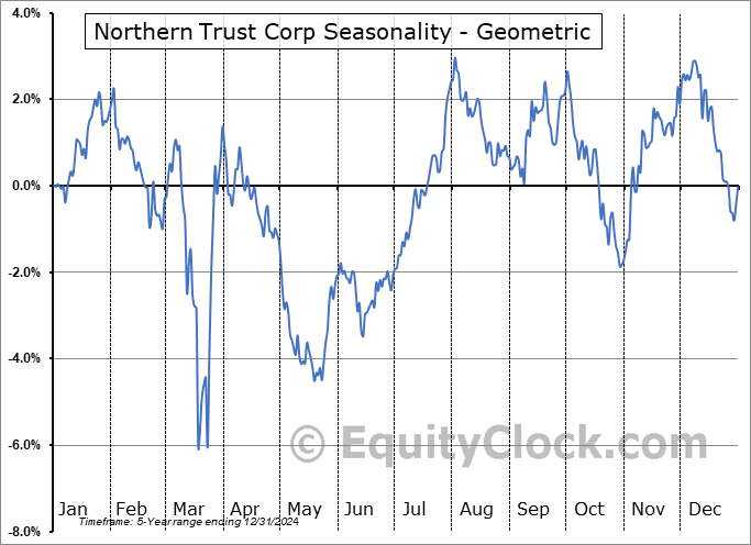 Analysis of the Northern Trust Corp (NASD:NTRSO) seasonal charts above shows that a Buy Date of July 10 and a Sell Date of September 30 has resulted in a geometric average return of 3.7% above the benchmark rate of the S&P 500 Total Return Index over the past 5 years. This seasonal timeframe has shown positive results compared to the benchmark in 5 of those periods. This is an excellent rate of success and the return strongly outperforms the relative buy-and-hold performance of the stock over the past 5 years by an average of 16.29% per year.