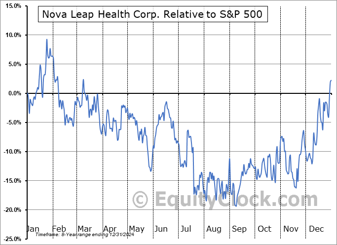 Analysis of the Nova Leap Health Corp. (TSXV:NLH.V) seasonal charts above shows that a Buy Date of November 7 and a Sell Date of January 28 has resulted in a geometric average return of 26.22% above the benchmark rate of the S&P 500 Total Return Index over the past 8 years. This seasonal timeframe has shown positive results compared to the benchmark in 8 of those periods. This is an excellent rate of success and the return strongly outperforms the relative buy-and-hold performance of the stock over the past 8 years by an average of 36.16% per year.