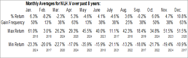 A word of caution: Only 8 years of data is available for shares of NLH.V, perhaps insufficient to create a seasonal profile that accurately gauges the seasonal tendencies influencing the investment. Ideally, while 20 years is preferred, at least 10 years of data is required to perform a seasonal analysis that is considered to be reliable for future seasonal periods.