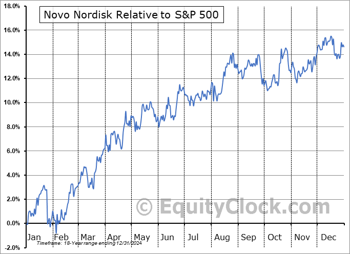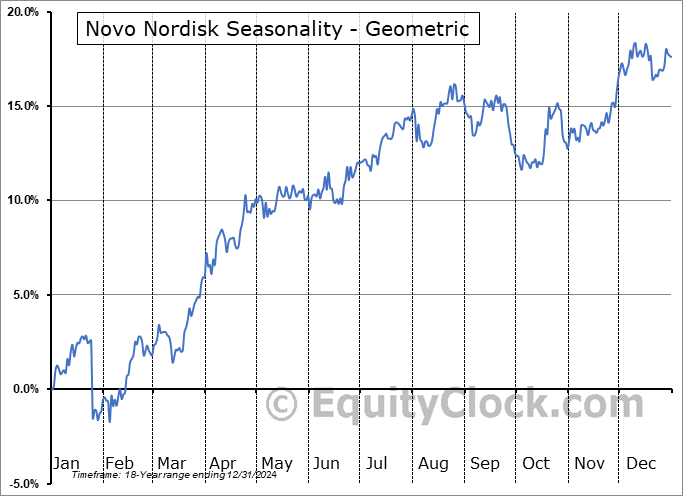Analysis of the Novo Nordisk (OTCMKT:NONOF) seasonal charts above shows that a Buy Date of February 6 and a Sell Date of June 11 has resulted in a geometric average return of 7.71% above the benchmark rate of the S&P 500 Total Return Index over the past 18 years. This seasonal timeframe has shown positive results compared to the benchmark in 16 of those periods. This is a very good rate of success and the return outperforms the relative buy-and-hold performance of the stock over the past 18 years by an average of 1.71% per year.