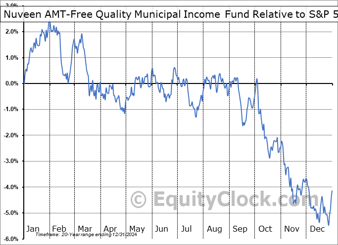 Analysis of the Nuveen AMT-Free Quality Municipal Income Fund (NYSE:NEA) seasonal charts above shows that a Buy Date of November 11 and a Sell Date of January 31 has resulted in a geometric average return of 1.65% above the benchmark rate of the S&P 500 Total Return Index over the past 20 years. This seasonal timeframe has shown positive results compared to the benchmark in 13 of those periods. This is a good rate of success and the return strongly outperforms the relative buy-and-hold performance of the stock over the past 20 years by an average of 6.97% per year.