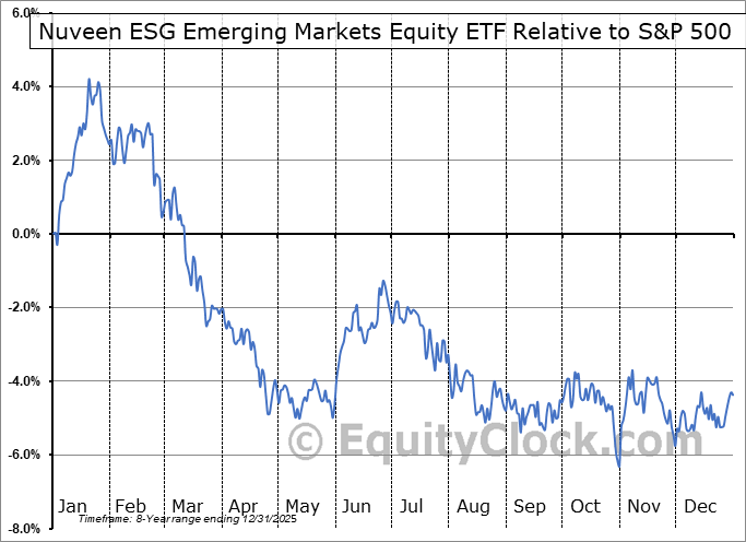 Analysis of the Nuveen ESG Emerging Markets Equity ETF (AMEX:NUEM) seasonal charts above shows that a Buy Date of November 30 and a Sell Date of February 26 has resulted in a geometric average return of 2.53% above the benchmark rate of the S&P 500 Total Return Index over the past 8 years. This seasonal timeframe has shown positive results compared to the benchmark in 7 of those periods. This is a very good rate of success and the return strongly outperforms the relative buy-and-hold performance of the stock over the past 8 years by an average of 11.01% per year.