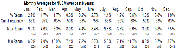 A word of caution: Only 8 years of data is available for shares of NUEM, perhaps insufficient to create a seasonal profile that accurately gauges the seasonal tendencies influencing the investment. Ideally, while 20 years is preferred, at least 10 years of data is required to perform a seasonal analysis that is considered to be reliable for future seasonal periods.