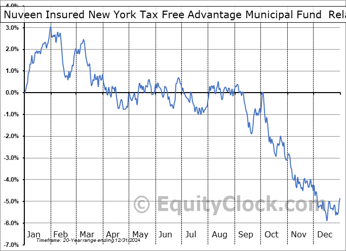 Analysis of the Nuveen Insured New York Tax Free Advantage Municipal Fund (NYSE:NRK) seasonal charts above shows that a Buy Date of December 2 and a Sell Date of March 7 has resulted in a geometric average return of 1.91% above the benchmark rate of the S&P 500 Total Return Index over the past 20 years. This seasonal timeframe has shown positive results compared to the benchmark in 13 of those periods. This is a good rate of success and the return strongly outperforms the relative buy-and-hold performance of the stock over the past 20 years by an average of 7.74% per year.