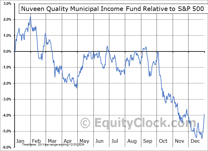 Analysis of the Nuveen Quality Municipal Income Fund (NYSE:NAD) seasonal charts above shows that a Buy Date of April 5 and a Sell Date of June 29 has resulted in a geometric average return of 1.14% above the benchmark rate of the S&P 500 Total Return Index over the past 20 years. This seasonal timeframe has shown positive results compared to the benchmark in 15 of those periods. This is a good rate of success and the return strongly outperforms the relative buy-and-hold performance of the stock over the past 20 years by an average of 6.4% per year.