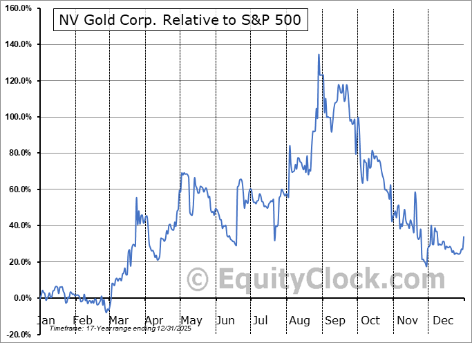 Analysis of the NV Gold Corp. (TSXV:NVX.V) seasonal charts above shows that a Buy Date of November 29 and a Sell Date of March 16 has resulted in a geometric average return of 9.35% above the benchmark rate of the S&P 500 Total Return Index over the past 16 years. This seasonal timeframe has shown positive results compared to the benchmark in 12 of those periods. This is a good rate of success and the return strongly outperforms the relative buy-and-hold performance of the stock over the past 16 years by an average of 40.1% per year.
