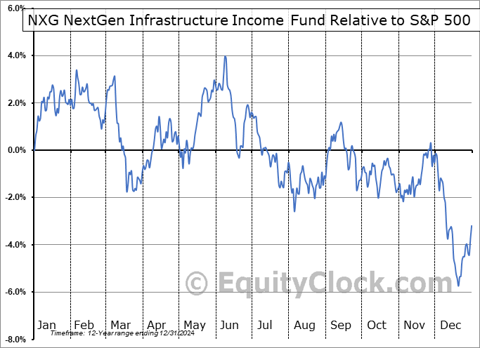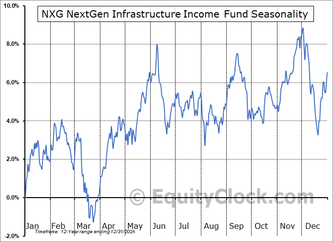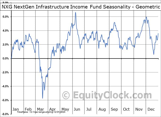Analysis of the NXG NextGen Infrastructure Income Fund (NYSE:NXG) seasonal charts above shows that a Buy Date of December 18 and a Sell Date of March 7 has resulted in a geometric average return of 1.36% above the benchmark rate of the S&P 500 Total Return Index over the past 12 years. This seasonal timeframe has shown positive results compared to the benchmark in 9 of those periods. This is a good rate of success and the return strongly outperforms the relative buy-and-hold performance of the stock over the past 12 years by an average of 11% per year.