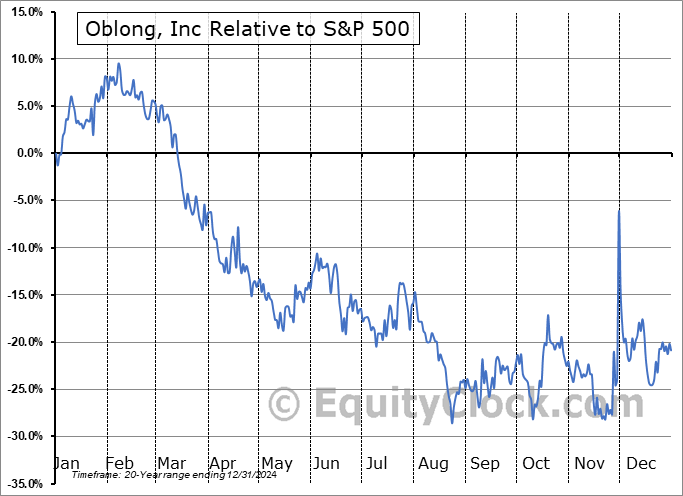 Analysis of the Oblong, Inc (NASD:OBLG) seasonal charts above shows that a Buy Date of November 15 and a Sell Date of February 3 has resulted in a geometric average return of 3.85% above the benchmark rate of the S&P 500 Total Return Index over the past 20 years. This seasonal timeframe has shown positive results compared to the benchmark in 13 of those periods. This is a good rate of success and the return strongly outperforms the relative buy-and-hold performance of the stock over the past 20 years by an average of 103.85% per year.